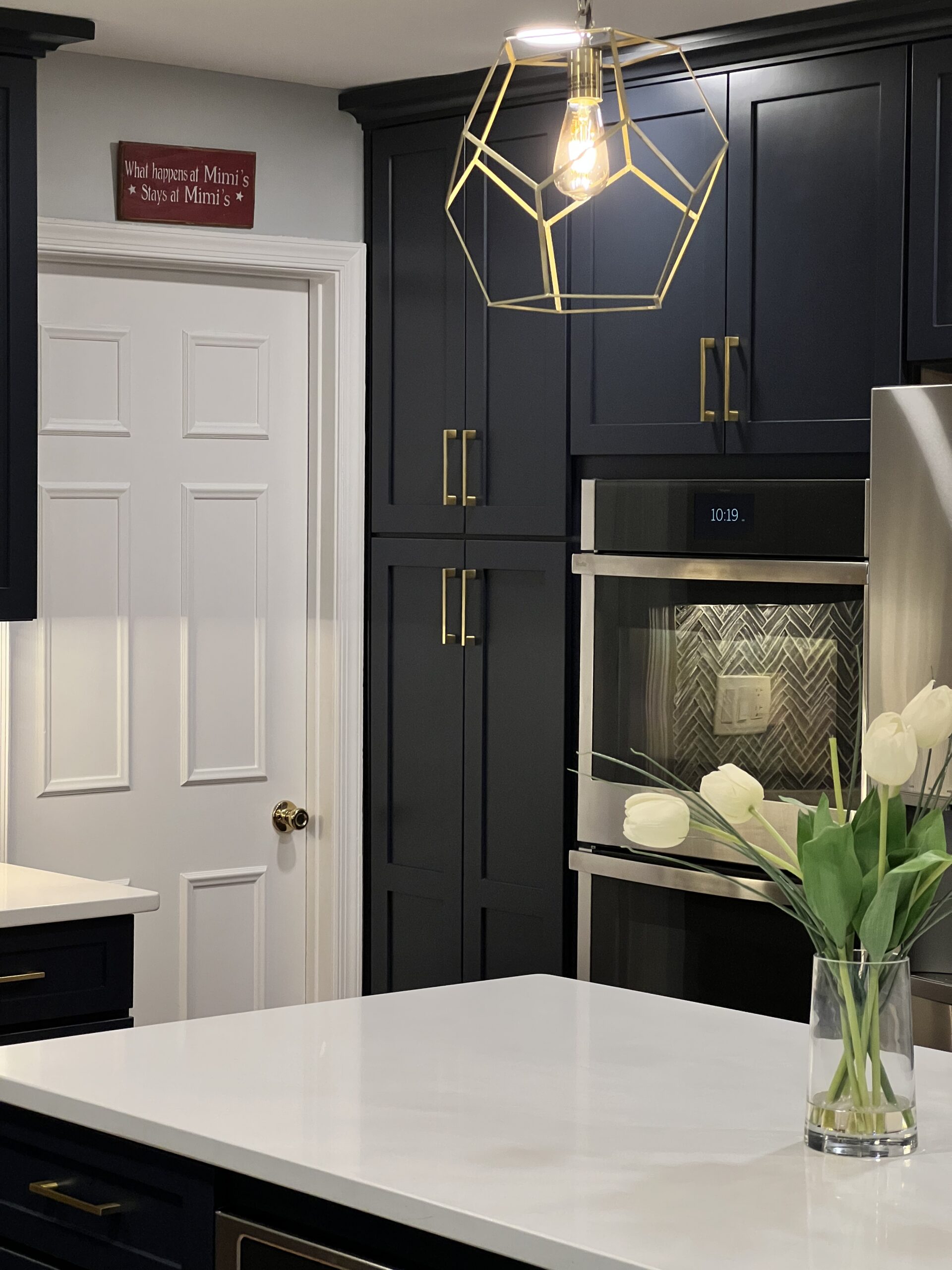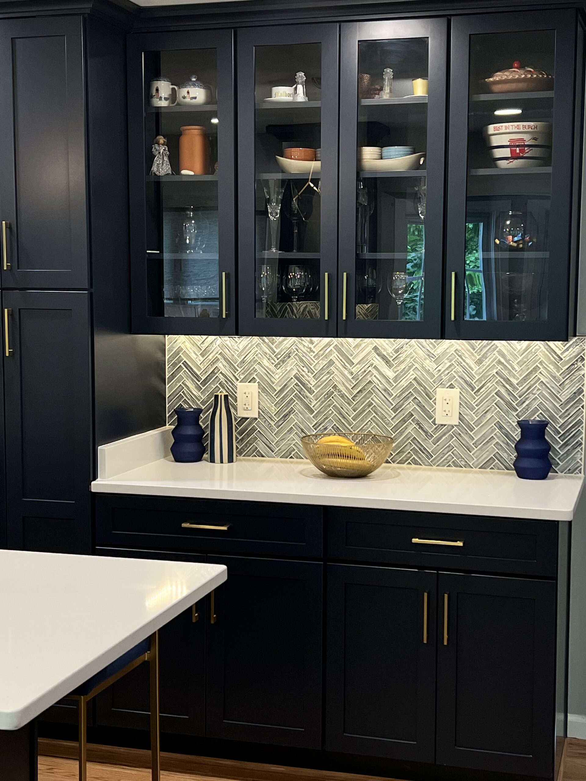 Custom Navy Shaker Cabinetry, Premium White Quartz Countertops, Glass Herringbone Tile Backsplash, Stainless Steel Professional Series Appliances, Stainless Steel Vent Hood, Brushed Gold Cabinet Pulls, Integrated LED Under-Cabinet Lighting, Oak Hardwood Flooring, Professional Grade Sub-floor Preparation, Electrical and Ventilation Rerouting.